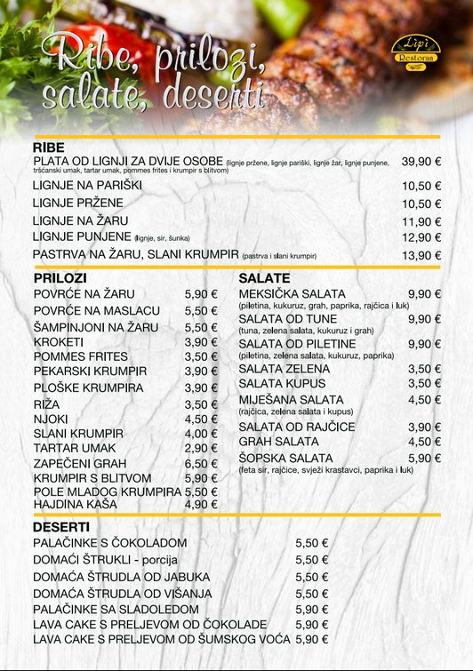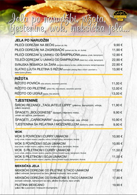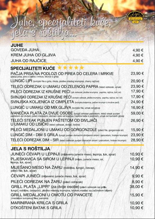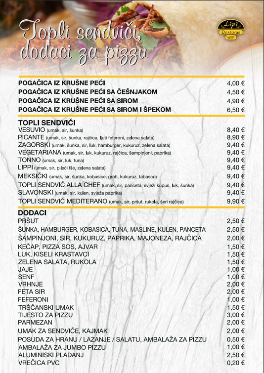 Restoran Lipi u ponudi nudi širok izbor hrane, od pizze i toplih sendviča iz krušne peći, svakodnevnih raznovrsnih gableca, do à la carte jela po narudžbi te raznovrsne ponude alkoholnih i bezalkoholnih pića. Najbolja domaća hrana na području Ivanca, iz ovoga restorana može se naručiti i na kućnu adresu, s mogućnošću besplatne dostave unutar pet kilometara. Uz vrhunsku hranu, poslužuju se i vrhunska vina domaće proizvodnje.